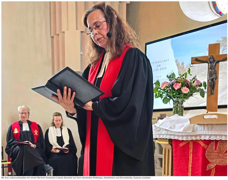 In einem besonderen Gottesdienst in der Kirche in Rinklingen haben Gläubige, Freunde, Bekannte und Ehrengäste Ortspfarrerin Annemarie Czetsch aus Bretten verabschiedet. „Ich liebe christliche Metalmusik“, gestand Czetsch und kündigte so die Band Skillet an, die mit dem Song „Stars“ rockige Töne in das Gotteshaus brachte. Geleitet wurde die Zeremonie von Dekanin Ulrike Trautz, Pfarrer Ralf Bönninger sowie Susanne Koch, Pfarrerin in Ruit, und von Czetsch selbst.