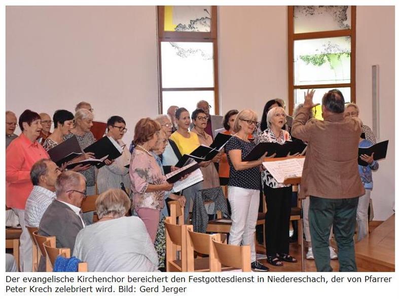 Evangelische Jakobusgemeinde feiert über die Gemeindegrenzen hinweg und betont dabei das gute Miteinander VON GERD JERGERNiedereschach/Dauchingen – Zum Abschluss des Festtages anlässlich des 40. Kirchenjubiläums der evangelischen Jakobusgemeinde Niedereschach, Dauchingen und Weilersbach wurde im evangelischen Gemeindezentrum in Niedereschach ein feierlicher, von Pfarrer Peter Krech zelebrierter Abschlussgottesdienst gefeiert. Begonnen hatte der Festtag bereits am Sonntagvormittag mit einem Gottesdienst in Dauchingen. Von dort wurde, verbunden mit einer Zwischeneinkehr bei der Familie Schleicher im Längental, nach Niedereschach gewandert. Der Gottesdienst am Sonntagabend wurde vom evangelischen Kirchenchor unter der Leitung von Dirigent Hartmut Lübben feierlich umrahmt und bereichert. Die Festpredigt hielt Pfarrer Peter Krech, der sich freute, dass auch sein katholischer Amtsbruder Frederik Reith, Niedereschachs Bürgermeister Martin Ragg und Alt-Bürgermeister Otto Sieber den Weg ins Gemeindezentrum gefunden hatten.