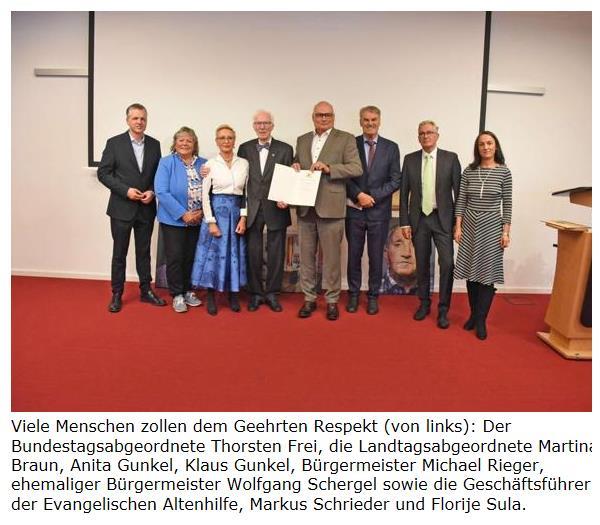 Für den Geehrten gibt es von den Gästen im Roten Löwen stehende Ovationen. Hübner StephanSt. Georgen Im Rahmen des Festaktes zum 60-jährigen Bestehen der Evangelischen Altenhilfe erhielt Klaus Gunkel die Ehrennadel des Landes Baden-Württemberg. Bürgermeister Michael Rieger lobte einen „äußerst engagierten Menschen“.