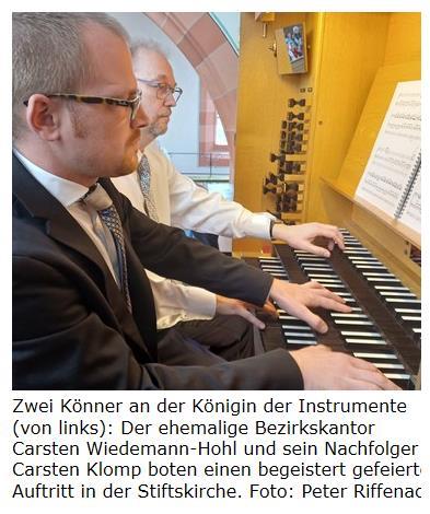 WERTHEIM. Der Auftritt der »Wertheimer Carstens« bei der letzten Orgelmusik zur Marktzeit (OzM) am Samstag hat rund 200 Zuhörer in die Stiftskirche gelockt. Die Spielfreude des ehemaligen Bezirkskantors Carsten Wiedemann-Hohl und seines Nachfolgers Carsten Klomp stieß auf begeisterte Resonanz im sehr gut gefüllten Kirchenschiff.