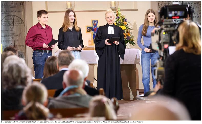 Eigentlich waren für das Jahr 2024 zwei weitere Gottesdienste geplant. Beide aus Palmbach, beide mit Anne Helene Kratzert. Doch der für 28. Juli geplante Gottesdienst fand nicht statt. Und auch der für den 20. Oktober geplante wird nicht aus Karlsruhe, sondern aus Heidelberg gesendet, wie beim ZDF zu lesen ist. Dass dies mit dem Abgang von Anne Helene Kratzert zu tun hat, scheint auf der Hand zu liegen. Die Pfarrerin ist im April in Palmbach verabschiedet worden. Doch ganz so einfach ist es dann doch nicht, weiß Simone Hahn. Sie ist Senderbeauftragte beim Gemeinschaftswerk der Evangelischen Publizistik (GEP) in Frankfurt am Main. Dort ist sie für die Erstellung eines Fernsehgottesdienstplans zuständig. Dieser wird dann vom Rat der Kirche beschlossen und dem ZDF als ausführende Sendeanstalt übermittelt, wo der Plan nochmal abgestimmt wird. „Der geplante Gottesdienst im Sommer ist wegen Olympia ausgefallen“, so Hahn.