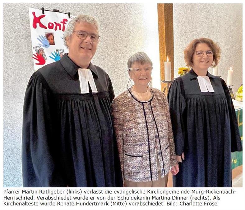 Murg – Im sonntäglichen Gottesdienst der evangelischen Kirchengemeinde Murg-Rickenbach-Herrischried wurde Pfarrer Martin Rathgeber von seinen Pflichten als Gemeindepfarrer entbunden und aus der Gemeinde verabschiedet. Er wagt einen Neubeginn als Seelsorger in Zell im Wiesental.