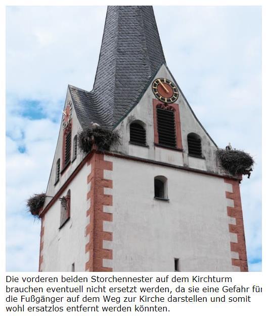 Gérard Mercier, Vorsitzender vom Nabu Kehl-Hanauerland, informierte, dass Störche sehr standorttreu sind und oft 30 Jahre zurück auf den alten Platz kommen. Er kenne Fälle, wo Störche Ersatznester nicht angenommen haben. Es sei nicht auszuschließen, dass trotz anderer Ersatzmöglichkeiten die Störche, wenn ihre alten Nester weg sind, während der Renovierung der Kirche etwa auf dem Baukran oder dem Gerüst anfangen ein Nest zu bauen.