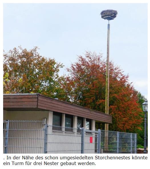 Als möglicher Standort kristallisierte sich immer mehr die Nachbarschaft des schon umgesiedelten Storchennestes heraus, und man favorisiert dort auch drei Nester. Allerdings sollten dies keine Einzelnester sein, sondern man würde eher einen Turm bauen, worauf dann drei neue Nester Platz hätten.