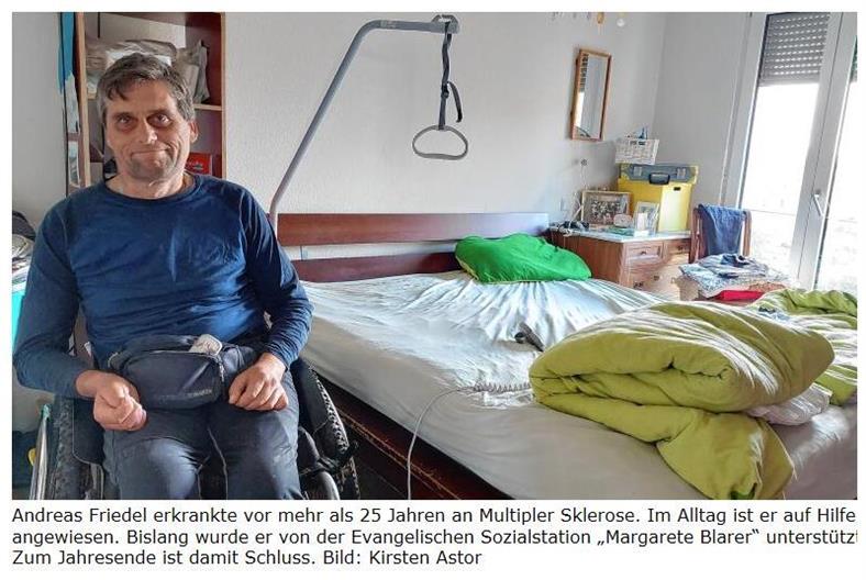 Sozialstation schließt überraschend Ende 2024 Das Aus trifft die Kunden „wie ein Donnerschlag“ Betreiber führen wirtschaftliche Gründe anKonstanz – „Es trifft uns wie ein Donnerschlag“, sagt der Konstanzer Andreas Friedel. Der 54-Jährige hat Multiple Sklerose und sitzt seit mehr als 25 Jahren im Rollstuhl. Um seinen Alltag zu bewältigen, ist er auf Hilfe angewiesen. Die bekam er bislang nicht nur von seiner Familie, sondern auch von Pflegekräften der Evangelischen Sozialstation „Margarete Blarer“ in der Gartenstraße im Stadtteil Paradies. Auf diese Hilfe kann er nun nicht mehr lange zählen. „Die Sozialstation wird vom Evangelischen Stift Freiburg ersatzlos und völlig überraschend zum 31. Dezember 2024 geschlossen“, so Friedel. „Viele Pflegebedürftige in Konstanz haben Angst und wissen nicht, wie es weitergeht.“