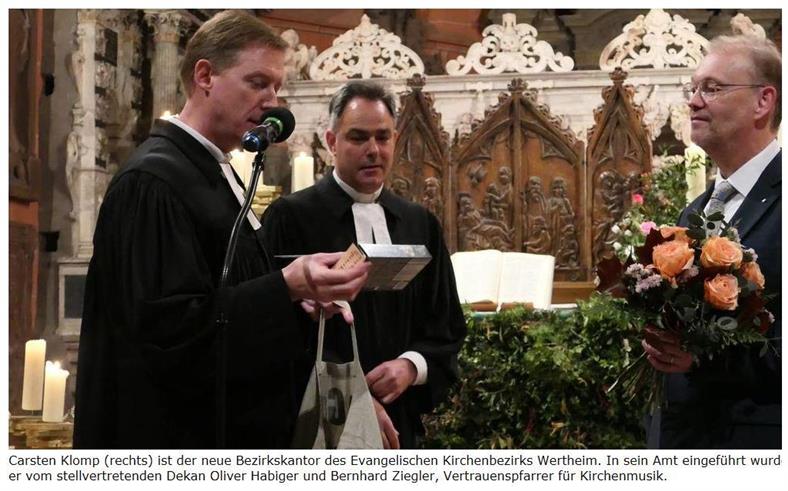 Birger-Daniel GreinWertheim. Kirchenmusikdirektor Professor Carsten Klomp hat sich in den vergangenen Jahren zu einem wichtigen Unterstützer der musikalischen Kulturlandschaft der Main-Tauber-Stadt und darüber hinaus entwickelt. Seit einem Monat fungiert er als Bezirkskantor des Kirchenbezirks Wertheim. Am Donnerstag wurde er im Rahmen des festlichen Reformationsgottesdienstes offiziell ins Amt eingeführt. Deutlich wurde dabei Klomps Wirken und seine große Liebe zur Musik.