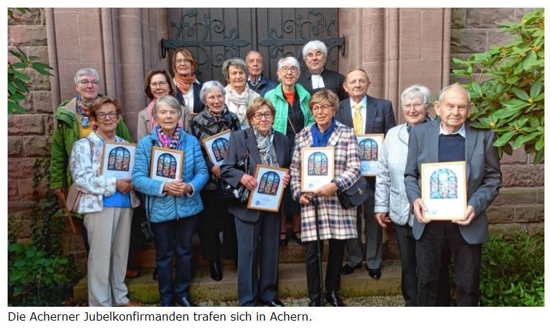 13 Senioren feiern Jubelkonfirmanden mit Pfarrer Matthias Uhlig in der evangelischen Gemeinde Achern. VON DIETER SIMONAchern. Im Gottesdienst am vergangenen Sonntag haben 13 einstige Konfirmanden ihre Jubelkonfirmation gefeiert: einmal goldene nach 50 Jahren, viermal diamantene nach 60 Jahren, fünfmal eiserne nach 65 Jahren und beachtliche dreimal die Gnadenkonfirmation nach 70 Jahren.