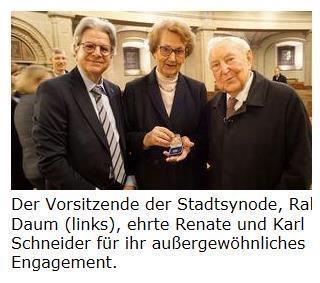 Im Rahmen des Gottesdienstes wurden Renate und Karl Schneider vom Vorsitzenden der Stadtsynode, Ralf Daum, mit der Konkordien-Medaille, der höchsten Auszeichnung der Evangelischen Kirche Mannheim für ehrenamtliches Engagement, geehrt. Gemeinsam bringen sie sich seit mehr als vier Jahrzehnten ein und fördern und ermöglichen durch ihre 2009 gegründete ‚Stiftung Christuskirche - Kirche Christi‘ viele Projekte in der evangelischen Gemeinde und in ganz Mannheim. „Das verdient höchste Anerkennung, … ist ein Vorbild an Engagement und Haltung, das selten geworden ist“, erklärte Daum.