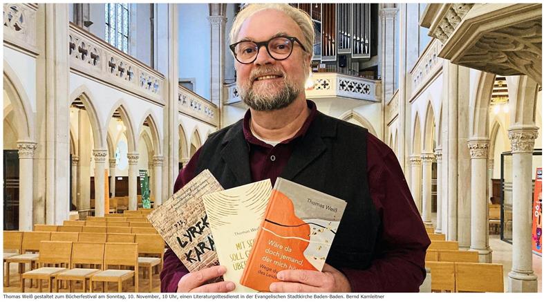 Mit „Süßer als Honig“ hat Weiß ein Zitat aus Psalm 19 aus der Bibel als Motto ausgewählt. Es geht um das Wort und um Worte. Das Wort in den Worten zu kosten, das nährt und schmeckt, findet der frühere Pfarrer der evangelischen Luthergemeinde in Baden-Baden. „Die Literatur gehört zum Religiösen wie das Licht zum Tag“, heißt es in der Einladung zum Literaturgottesdienst. Die Idee von Weiß, mit diesem Format die Premiere des Bücherfestivals zu bereichern, ist bei den Organisatoren auf Anhieb auf offene Ohren gestoßen. Entstanden ist sie bei einem Gespräch mit dem örtlichen Buchhändler Josua Straß. Der ist maßgeblich daran beteiligt, dass die Veranstaltung in Baden-Baden stattfinden kann.