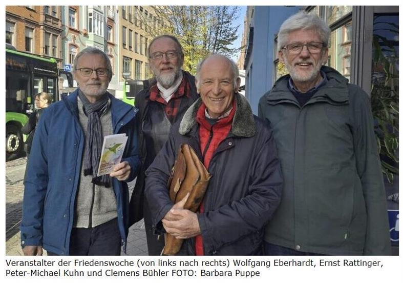 Die Initiatoren haben nicht die Illusion, die Weltpolitik ändern zu können. „Wir sind uns der begrenzten Wirkmöglichkeiten bewusst, manchmal deswegen verzagt, aber dann kommt die Nachfrage: Ihr macht doch wieder was?“, erzählt Ernst Rattinger von der Deutschen Friedensgesellschaft (DFG-VK) Mittelbaden. „Ich will meinem Enkel einmal sagen können, dass wir es wenigstens versucht haben“, fügt Wolfgang Eberhardt, ebenfalls DFG-VK, hinzu. Mehr als 200 Interessierte hätten 2023 die Veranstaltungen besucht. Das Motto der Friedensbewegung der 1980er Jahre, „Frieden schaffen ohne Waffen“, habe nicht ausgedient. Es gehe darum, Alternativen zum Krieg als Konfliktlösung und die Entwicklung dahin aufzuzeigen und „friedenstüchtig“ zu werden, wie der ehemalige evangelische Landesbischof Jochen Cornelius-Bundschuh formuliert hat.