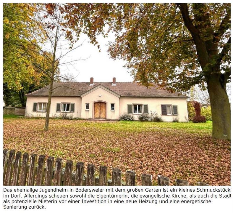 Das Jugendheim mit seinem großen Garten ist eine grüne Oase in Bodersweier. Doch im Moment steht es leer. Die Heizung müsste dringend saniert werden. VON NINA SAAMKehl-Bodersweier. Bei der Ortschaftsratssitzung am Donnerstag kam in der Bürgerfragestunde die Frage auf, was mit dem alten Jugendheim in der Ortsmitte, das der evangelischen Kirche gehört, geschehen soll.