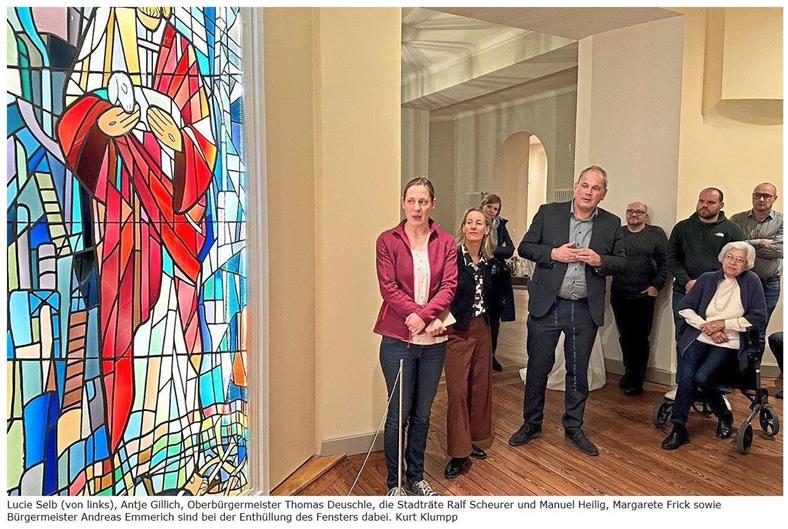 Der Lions Club Eremitage Waghäusel steuerte zudem 2.500 Euro bei. Waghäusels Kulturbeauftragte Antje Gillich ging bei der Feier auf die Geschichte des Betsaals ein, der 1860 von der Direktion der Zuckerfabrik für die protestantischen Beschäftigten eingerichtet wurde. Nach der Werksordnung mussten damals die Mitarbeitenden sonntags zum Gottesdienst gehen. Gillich beschrieb auch den langen Weg von der Schenkung des Fensters durch den evangelischen Oberkirchenrat an die Stadt Waghäusel bis zur heutigen Präsentation.