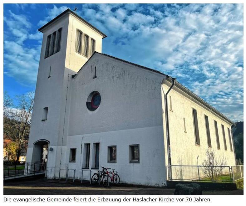 Am ersten Adventssonntag 1954 wurde die evangelische Kirche in Haslach eingeweiht. Die Kirchengemeinde feiert dies am kommenden Sonntag mit einem feierlichen Gottesdienst und vielen Gästen. VON MARIA BENZHaslach. Mit einem großen Festgottesdienst feiert die evangelische Gemeinde am kommenden Sonntag den Bau der evangelischen Kirche in Haslach vor 70 Jahren. Wie damals die Einweihung wird auch das Jubiläum am ersten Adventssonntag stattfinden. Der Festgottesdienst am 1. Dezember mit Pfarrer Christian Meyer und Erik Buboltz beginnt um 10.30 Uhr.