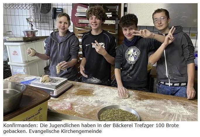 In der Bäckerei Trefzger haben die Schopfheimer Konfirmanden im Rahmen des Konfirmandenunterrichts an der bundesweiten Aktion „5000 Brote“ teilgenommen. Bei dieser Aktion backen die Konfirmanden aller Landeskirchen der Evangelischen Kirche in Deutschland (EKD) Brote zugunsten von Kinder- und Jugendbildungsprojekten in aller Welt. Die Bäckerbetriebe öffnen für diese Aktion ihre Backstuben. Die Konfis backen dort selbst Brot und gewinnen dabei einen Einblick in einen handwerklichen Beruf und erleben das Wunder des Teilens. Dieses Jahr haben die Jugendlichen rund 100 Brote gebacken, die sie am Sonntag, 1. Dezember, im Anschluss an den Gottesdienst ab zirka 10.45 Uhr im Eingangsbereich der Stadtkirche Schopfheim gegen eine Spende abgeben. Der Spendenerlös geht an „Brot für die Welt“. Damit werden Ausbildungsprojekte in Vietnam, Malawi und Paraguay unterstützt. Die Brote wurden nach dem Backen eingefroren und werden am Verkaufstag frisch aufgebacken. BZ