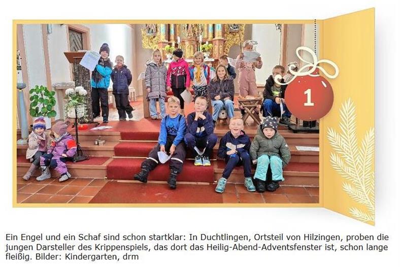 In den meisten Orten symbolisiert das Krippenspiel an Heiligabend in der Kirche das letzte Adventsfenster. In Bittelbrunn (Engen) sind die Darsteller der Weihnachtsgeschichte Kinder ab dem Kindergarten-Alter. In Duchtlingen (Hilzingen) sind die jüngsten der 19 kleinen Mimen sogar erst zwei Jahre alt. Wie Stefanie Kessinger vom Organisations-Team berichtet, ist die „Hördäpfelmetropole des Hegaus“ diesmal bereits am Samstag, 23. November, mit einem kleinen Weihnachtsmarkt als erstem Adventsfenster gestartet.