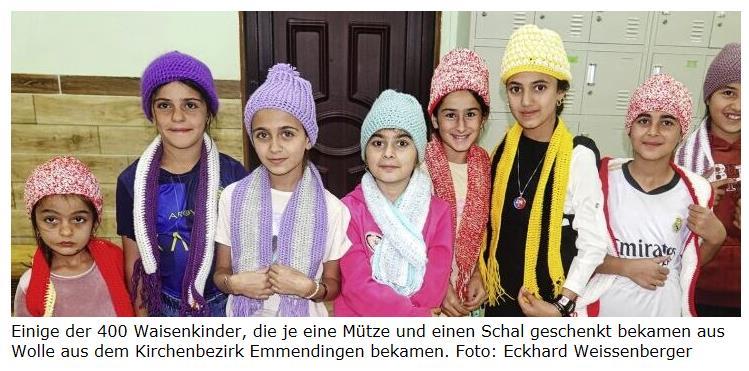 Dank der Unterstützung aus Bahlingen und dem ganzen Kirchenbezirk Emmendingen können sich 400 Waisen- und Halbwaisenkinder im Flüchtlingslager im Nordirak in diesem Winter über eine warme Mütze und einen Schal freuen. Die Aktion, die vom ehemaligen Pfarrer Eckhard Weißenberger ins Leben gerufen wurde, zeige, wie Solidarität Grenzen überwindet, heißt es in einer Presseinformation. Wollspenden kamen auch aus Mannheim, Sigmaringen und Meißenheim.