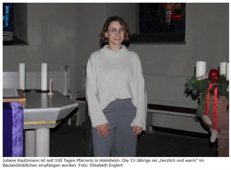 Seit 100 Tagen ist sie als neue Pfarrerin im Amt. Ihr Ziel ist es, die Menschen zusammenzubringen. Elisabeth Englert"Predigen und segnen sind meine liebsten Amtshandlungen", erzählt Pfarrerin Juliane Kautzmann – und man glaubt es ihr sofort angesichts ihrer leuchtenden Augen. Sie wirkt zufrieden, in sich ruhend, scheint angekommen zu sein – zwar nicht im Pfarrhaus, noch wohnt sie zur Miete, vielmehr in "ihrer" Kirchengemeinde in Adelsheim, in der sie "herzlich und warm" empfangen worden sei. Seit dem 1. September, also seit 100 Tagen, sorgt sie sich als Pfarrerin im Probedienst um die ihr anvertrauten Seelen. Und das, obwohl ihr lange nicht bewusst war, dass dieser Beruf ihre Berufung sein werde.