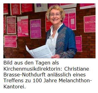Christiane Brasse-Nothdurft feiert ihren 70. Geburtstag und blickt auf fast 40 Jahre musikalische Arbeit an der Melanchthonkantorei zurück. Auch im Ruhestand bleiben ihre Energie und Leidenschaft ungebrochen Stefan M. DettlingerMannheim. Am Telefon lacht sie erst mal ganz viel. Und dann noch mehr. Das passt. Eine Portion Glück per Telefon in diesen trüben Tagen - man hat fast Lust, Christiane Brasse-Nothdurfts Nummer zu veröffentlichen für Leute, die seelische Unterstützung benötigen. Aber blicken wir zurück: „Eine Christiane 2.0 - das könnt ihr so nicht erwarten“, soll der stellvertretende Landeskirchenmusikdirektor kurz vor ihrem Ausscheiden gesagt haben. Es war 2019. Es ging um die Nachfolge in der Melanchthonkantorei. Und Johannes Michel sollte auch recht behalten, denn bald danach wurde das Blockflötenensemble eingestellt und spaltete sich der Popchor von der Gemeinde ab. CBN hatte ihn 2003 gegründet - und groß gemacht (Nachfolgerin Beate Rux-Voss sucht jetzt nach neuen Mitgliedern für einen neuen Pop-Chor).