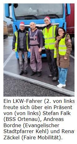300 kleine Geschenke haben Freiwillige an LKW-Fahrer entlang der A5 verteilt. Die ökumenische Aktion „Lenkpause im Advent“ soll auch dafür sorgen, dass die Fernfahrer ihre Rechte kennenlernen.Ortenau (red/aah). 300 kleine Geschenke verteilten Freiwillige auch in diesem Dezember an LKW-Fahrer an Raststätten in der Ortenau entlang der A5. Organisiert wurde die Aktion „Lenkpause im Advent“ von der Betriebsseelsorge (BSS) der katholischen Erzdiözese Freiburg und dem kirchlichen Dienst in der Arbeitswelt der Evangelischen Landeskirche Baden (KDA), wie es in einer Mitteilung heißt. Überreicht wurde den LKW-Fahrern neben Schokolade, Grußkarte und Schutzengel-Schlüsselanhänger auch eine mehrsprachige Info-Broschüre von der Beratungsstelle für Fernfahrer.