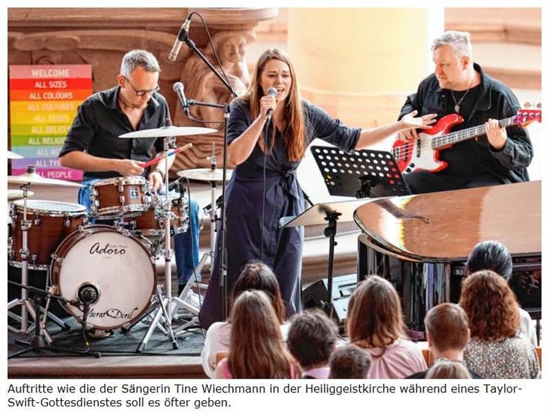 Der erste Taylor-Swift-Gottesdienst mit Songs des Megastars im Mai war schon ein Renner, nun wartet die Heiliggeistkirche in Heidelberg 2025 erneut damit auf. Unter dem Motto „Take me to Church, Taylor!“ startet die Neuauflage in dem Gotteshaus am 16. März 2025. Der Gottesdienst werde aber mit anderen Liedern des Popstars und anderen Texten gestaltet, betont eine Sprecherin der Evangelischen Landeskirche Baden. Zu erleben auch beim Kirchentag in Hannover.
