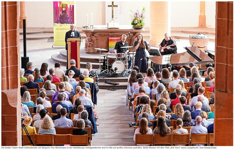 Der erste Taylor-Swift-Gottesdienst mit Songs des Megastars im Mai war schon ein Renner, nun wartet die Heiliggeistkirche in Heidelberg 2025 erneut damit auf. Unter dem Motto „Take me to Church, Taylor!“ startet die Neuauflage in dem Gotteshaus am 16. März 2025. Der Gottesdienst werde aber mit anderen Liedern des Popstars und anderen Texten gestaltet, betont eine Sprecherin der Evangelischen Landeskirche Baden. Zu erleben auch beim Kirchentag in Hannover.