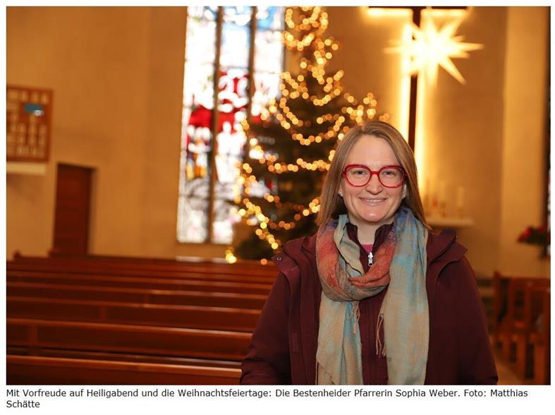 WERTHEIM-BESTENHEID. Geschenke kaufen, Karten schreiben, Plätzchen backen, Weihnachtsmärkte und Weihnachtsfeiern sind eigentlich nur Vorgeplänkel, denn das große Fest kulminiert an einem Tag: Heiligabend. Viele Pfarrerinnen und Pfarrer in der Region sind dann wieder gefragt, die richtigen Worte für die christliche Botschaft zu finden. Eine davon: Sophia Weber, die sich vorher stets zwischen Besinnlichkeit und Schwerstarbeit bewegt.