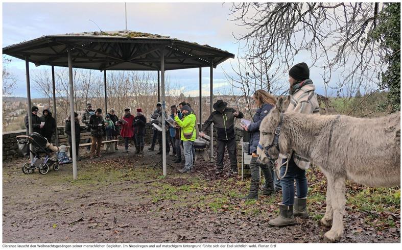 Florian ErtlEin Spaziergang der besonderen Art erwartete am Sonntagmittag rund 40 Teilnehmer am Brettener Hohberghaus. Unter dem Motto „Weihnachtsspaziergang – mit dem Esel unterwegs“ luden die Evangelische Kirche Region Bretten und das Vokalensemble „Die Spontanen“ zu einer adventlichen Wanderung ein. Mit dabei: Esel Clarence, der treue Begleiter der Gruppe auf dem etwa drei Kilometer langen Weg über den Hohberg.