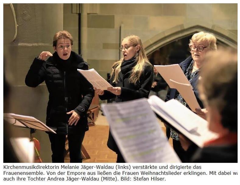 Auf traditionelle Weise feierten die Katholiken im Münster mit Stadtpfarrer Bernd Walter die Weihnachtsgottesdienste. Zur Christmette an Heiligabend versammelte sich die Gemeinde schon vor Beginn um 22 Uhr im Kirchenschiff. Zur Einstimmung ließ das Frauenensemble des Münsterchors unter der Leitung von Kirchenmusikdirektorin Melanie Jäger-Waldau dreistimmige Weihnachtlieder erklingen. Die von der Orgelempore herab a cappella gesungenen Lieder setzten anrührende musikalische Lichtpunkte im Dunkel der heiligen Nacht. Wolfram Asshoff gestaltete auf der Querflöte die Zwischenspiele mit pastoralen Weisen der Barockzeit. Mit Beginn der Christmette wurde der Kirchenraum erhellt.